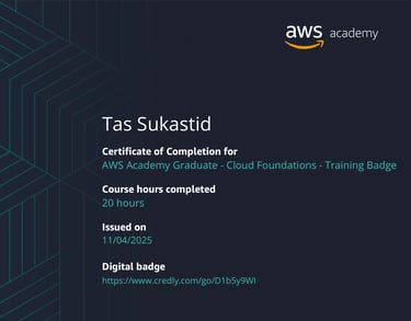 My name is Tas Sukastid, and I am currently pursuing my studies at the Faculty of ICT with a strong focus on data science and artificial intelligence.